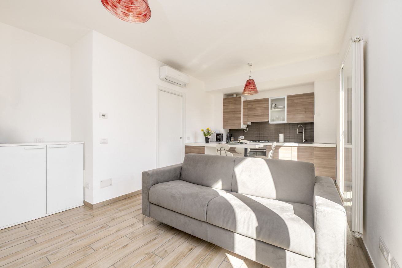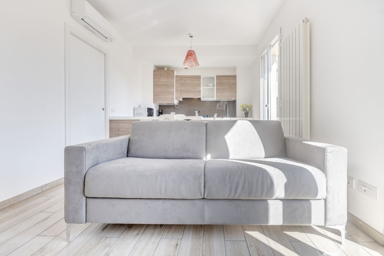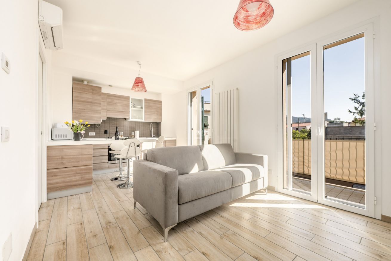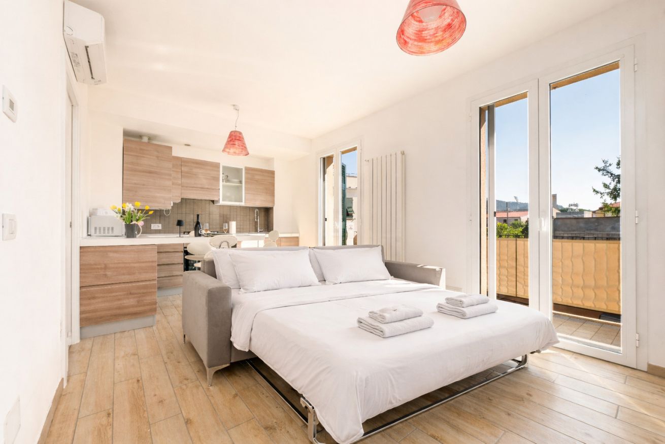 La zona giorno open space è il cuore della casa: cucina completamente attrezzata e soggiorno convivono in uno spazio accogliente e funzionale, perfetto dopo una giornata tra mare, escursioni o visite nei borghi liguri. Il divano letto consente di ospitare fino a 4 persone, rendendo l’appartamento ideale per coppie, famiglie o piccoli gruppi.