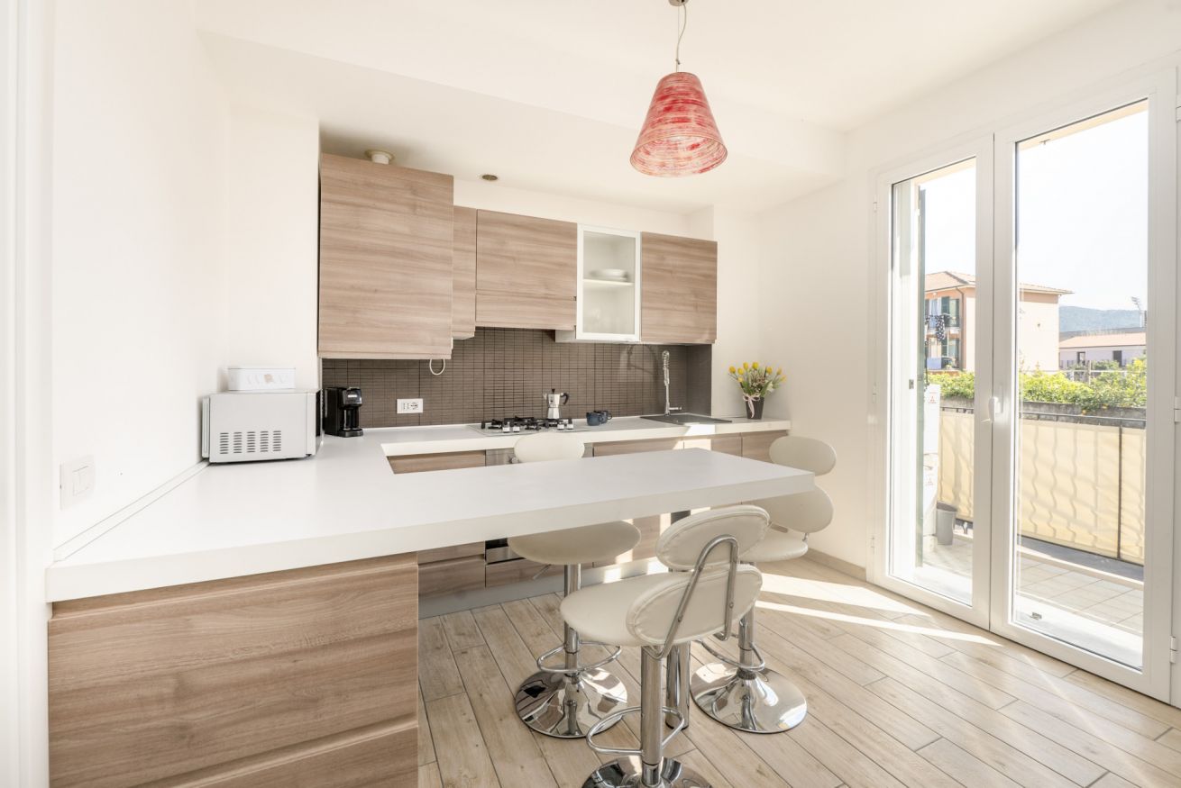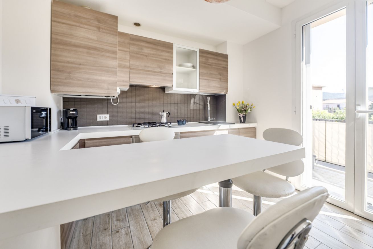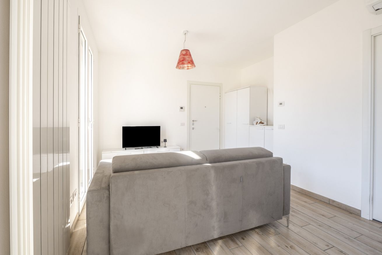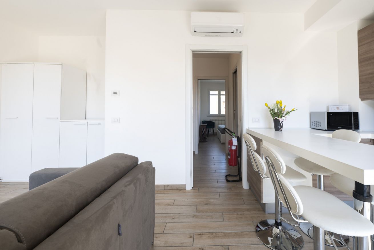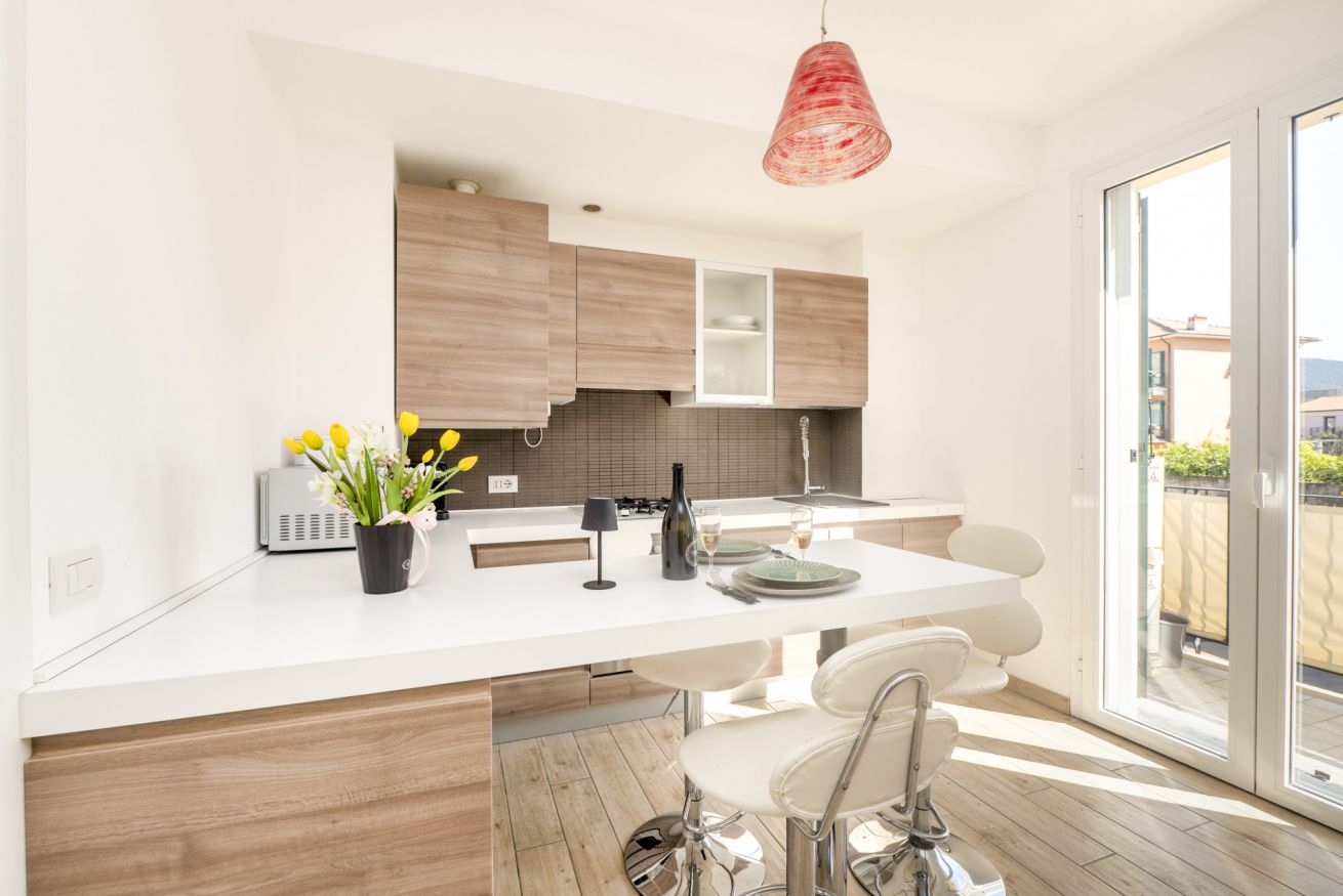 La zona giorno open space è il cuore della casa: cucina completamente attrezzata e soggiorno convivono in uno spazio accogliente e funzionale, perfetto dopo una giornata tra mare, escursioni o visite nei borghi liguri. Il divano letto consente di ospitare fino a 4 persone, rendendo l’appartamento ideale per coppie, famiglie o piccoli gruppi.