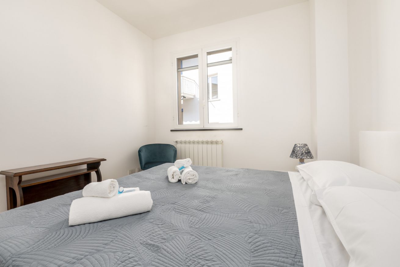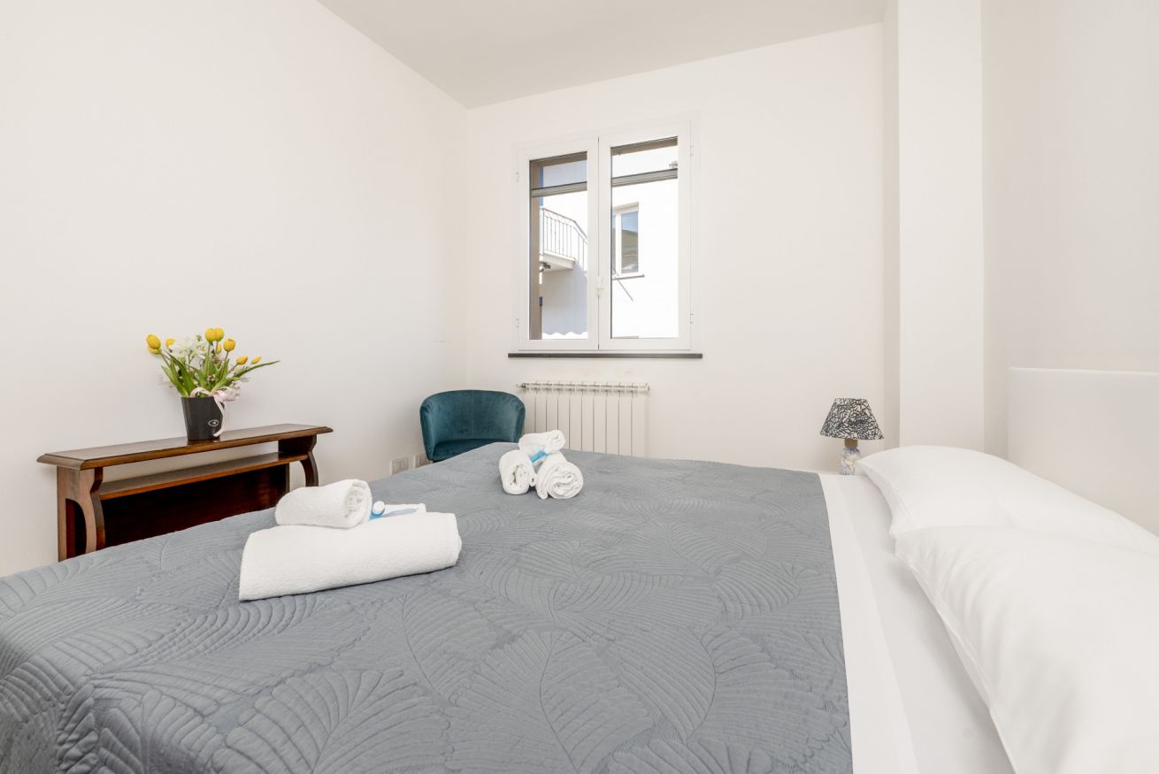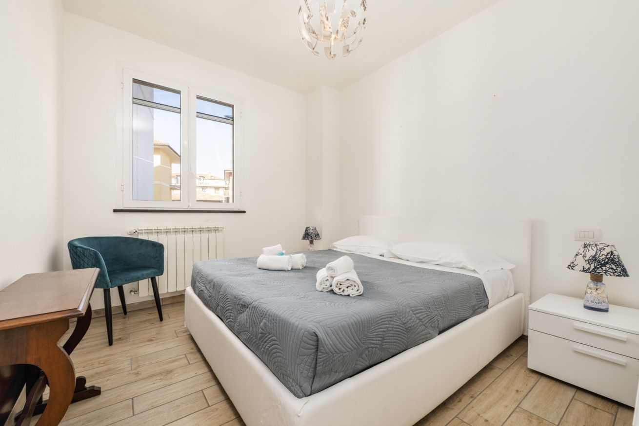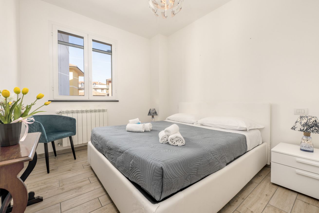La camera matrimoniale è silenziosa e confortevole, ideale per un riposo di qualità. Il balcone offre uno spazio esterno pratico per una pausa o per arieggiare gli ambienti.