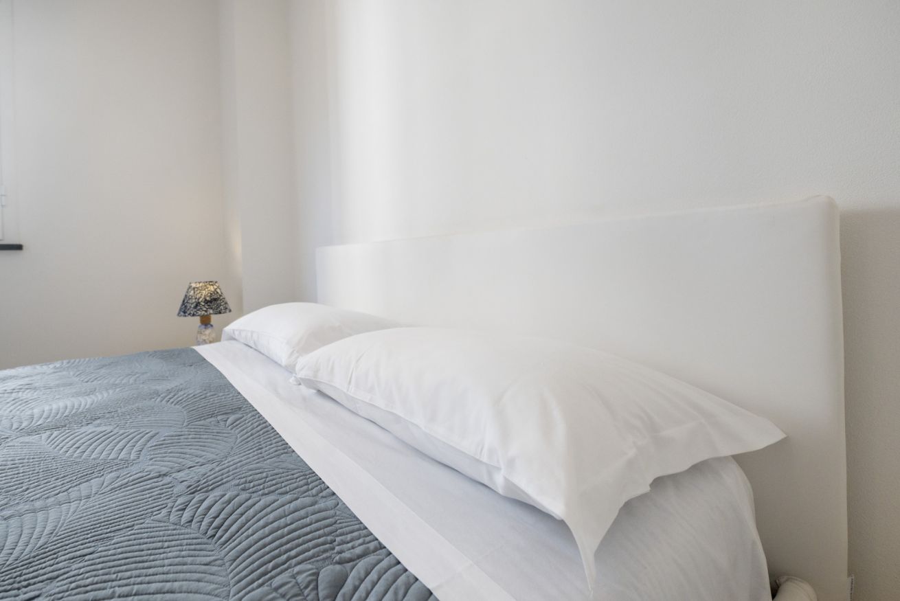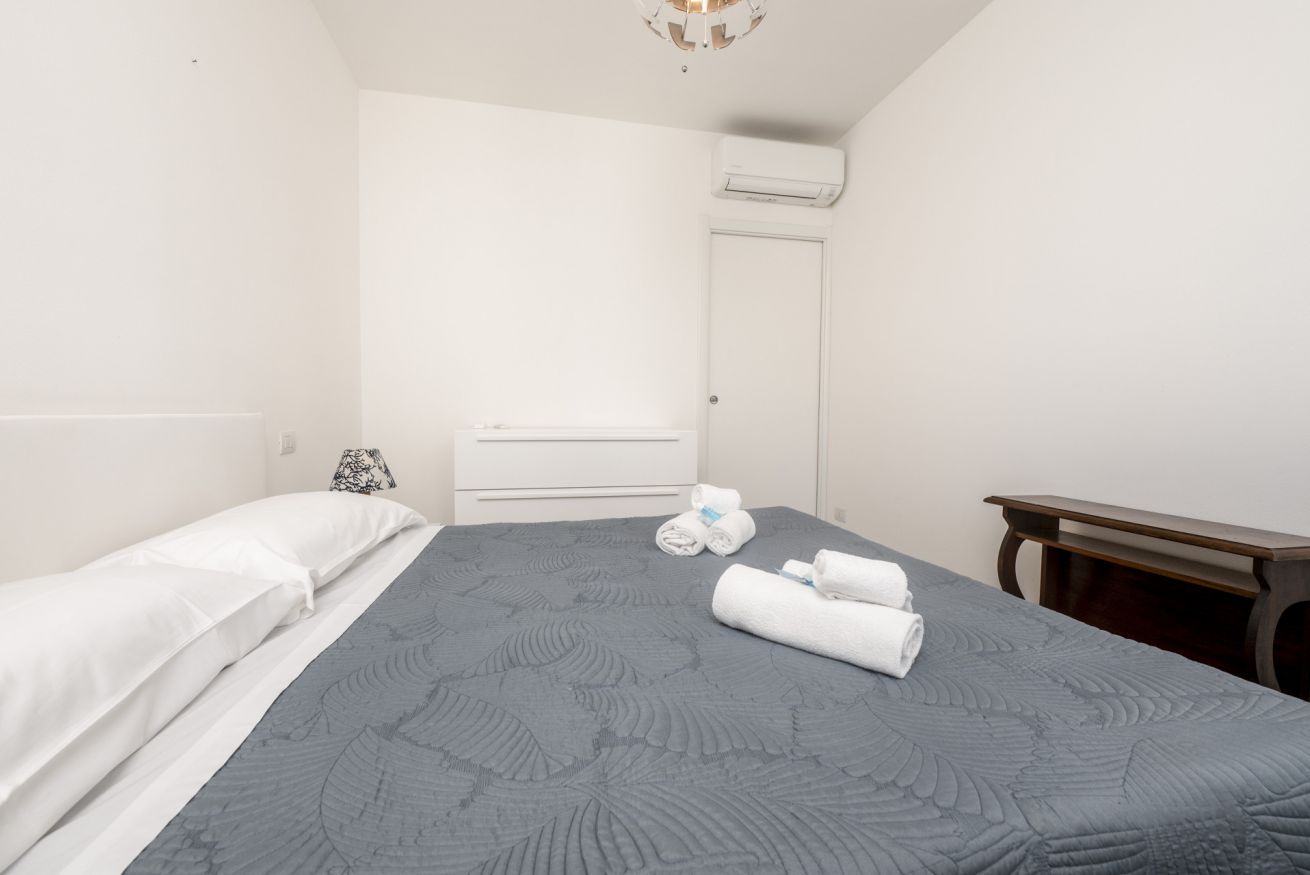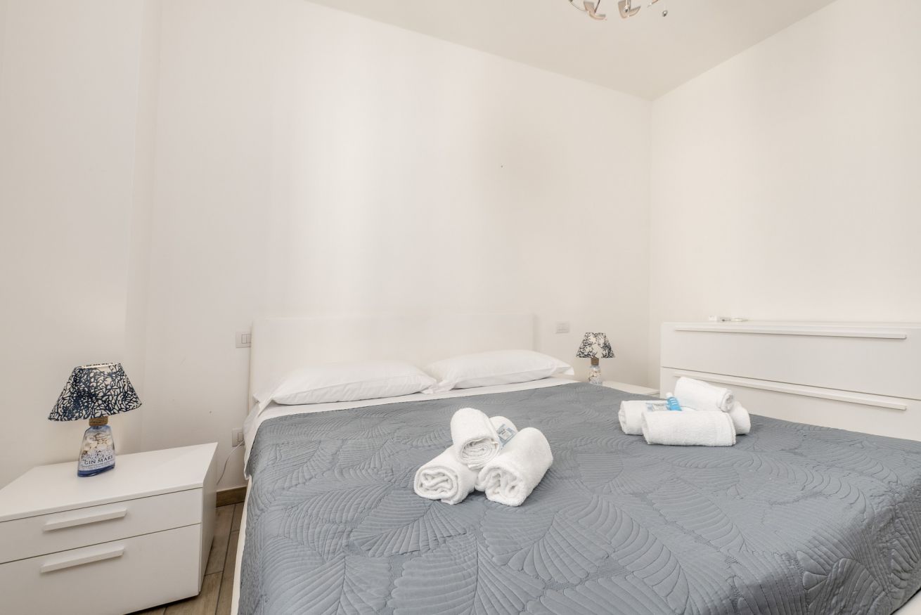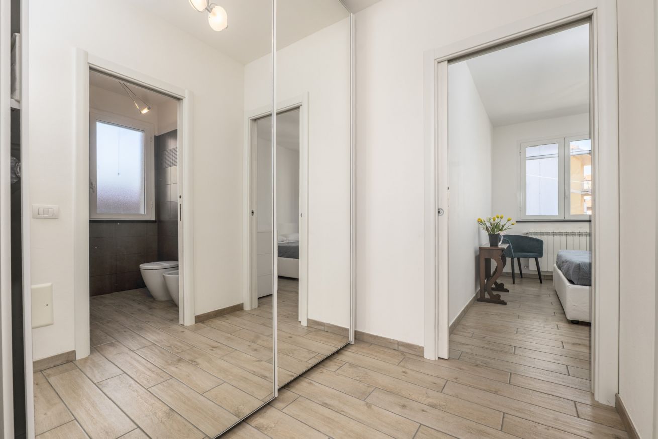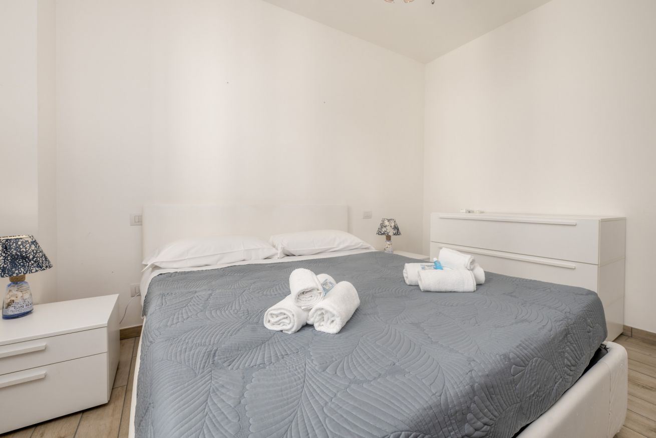 La camera matrimoniale è silenziosa e confortevole, ideale per un riposo di qualità. Il balcone offre uno spazio esterno pratico per una pausa o per arieggiare gli ambienti.