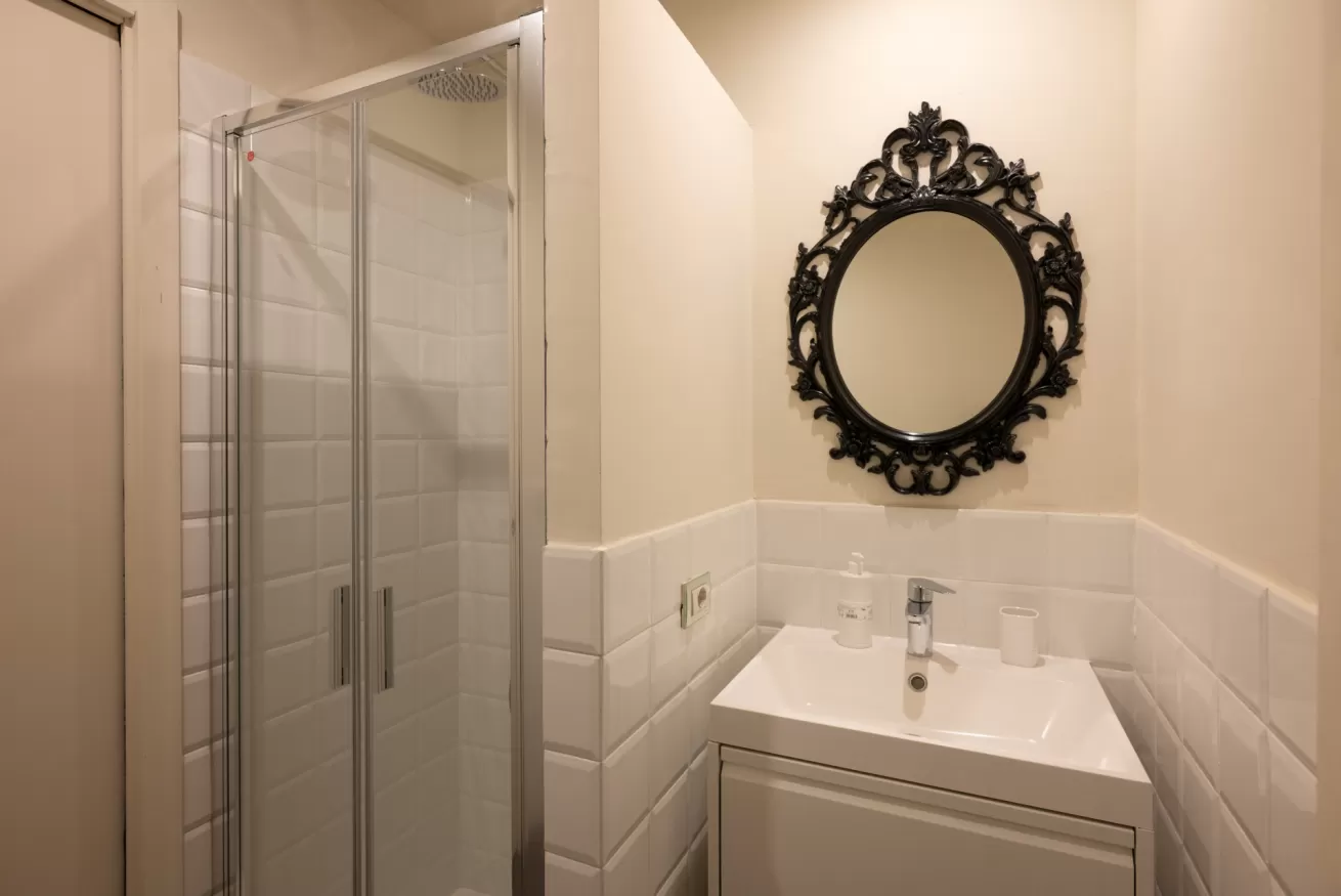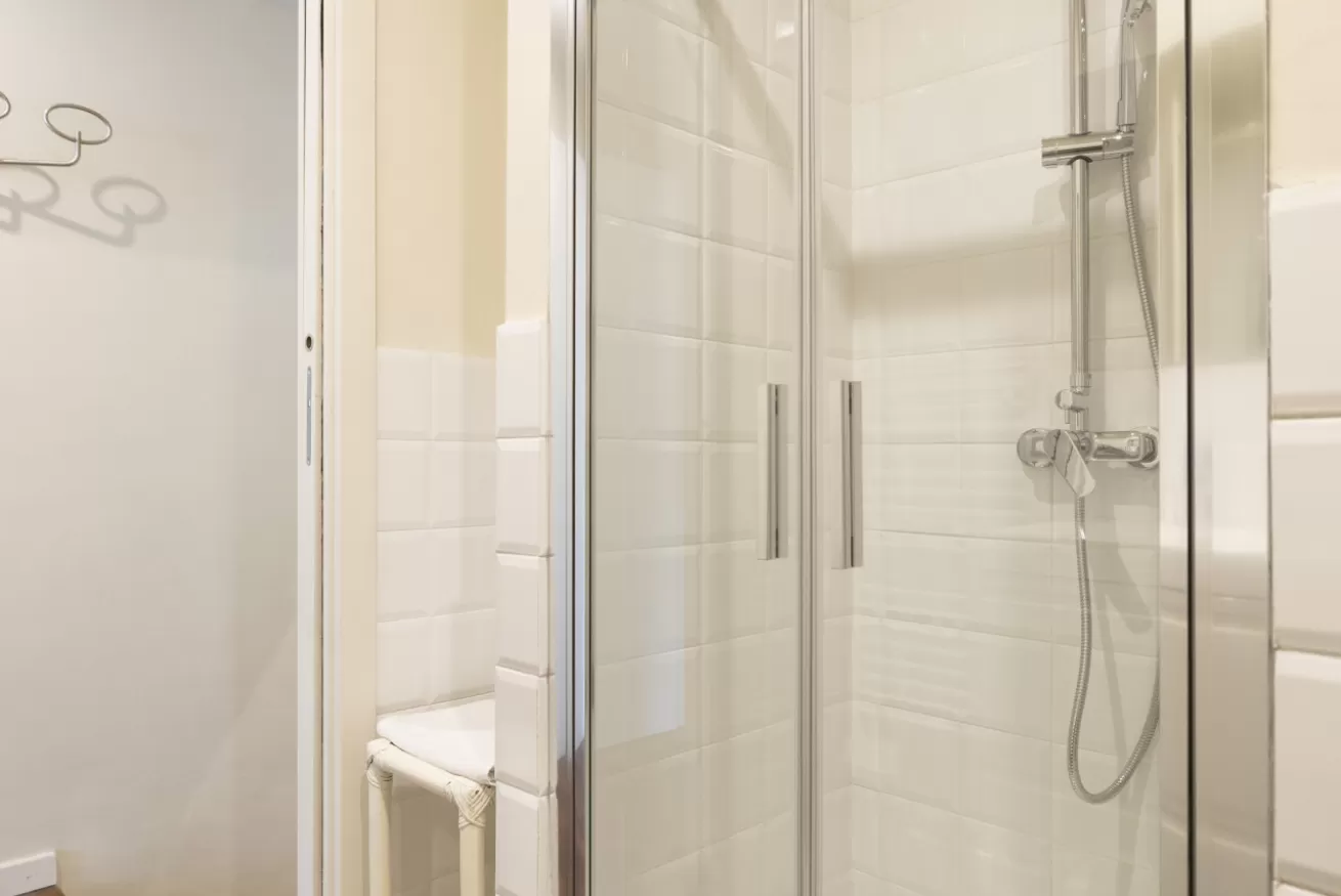 The separate bedroom is furnished with a double bed and a large wardrobe, ensuring space and comfort. The bathroom, equipped with a shower box, completes the apartment, which stands out for its large windows that let in plenty of natural light, making the rooms even more welcoming and bright.