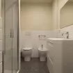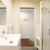 The separate bedroom is furnished with a double bed and a large wardrobe, ensuring space and comfort. The bathroom is complete with all the sanitary fixtures and a shower box.