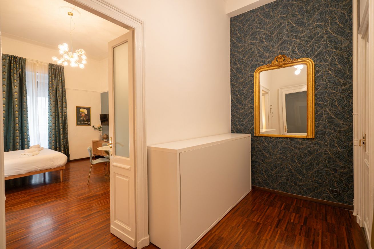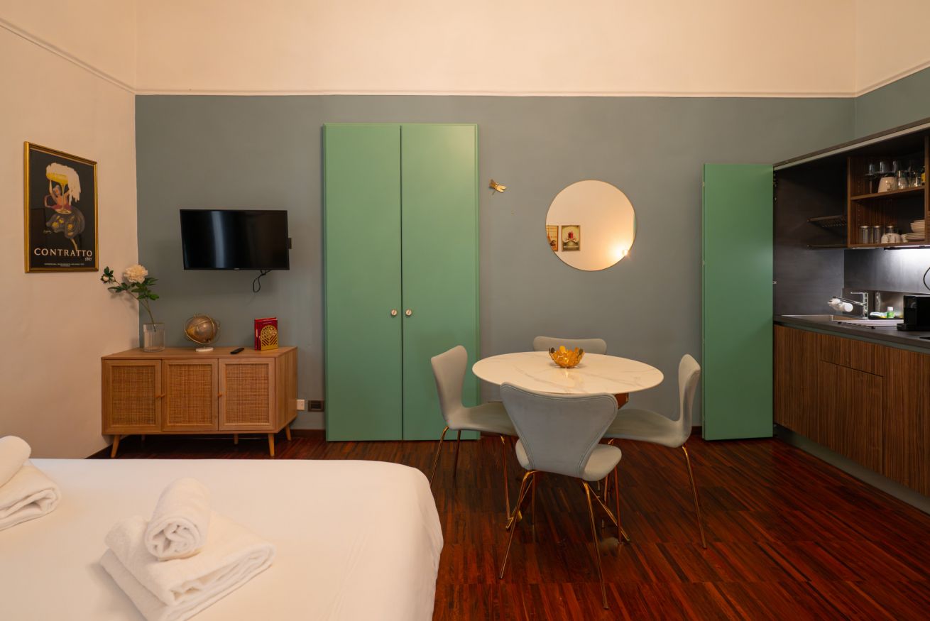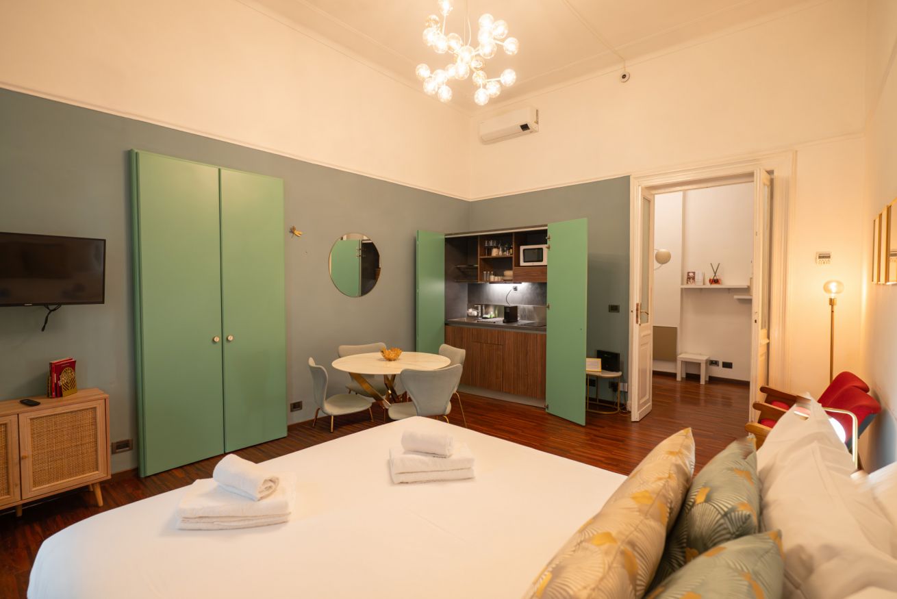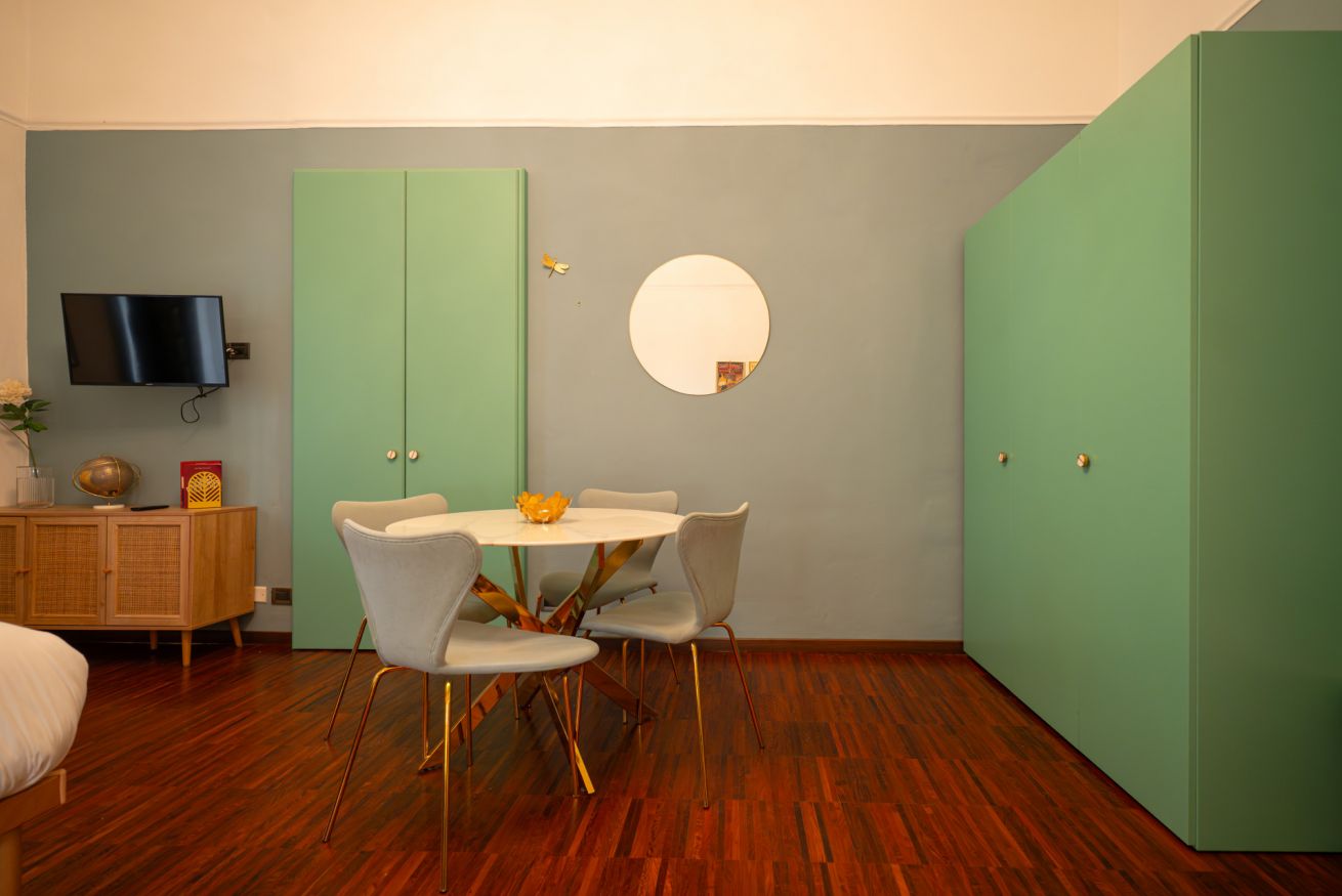 L’atmosfera è calda, con richiami art déco e palette sofisticate che valorizzano la luce naturale. Non è il classico monolocale “compresso”: qui gli spazi sono ben distribuiti e vivibili.
