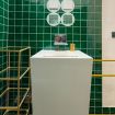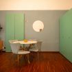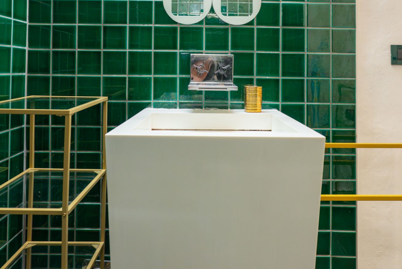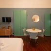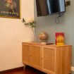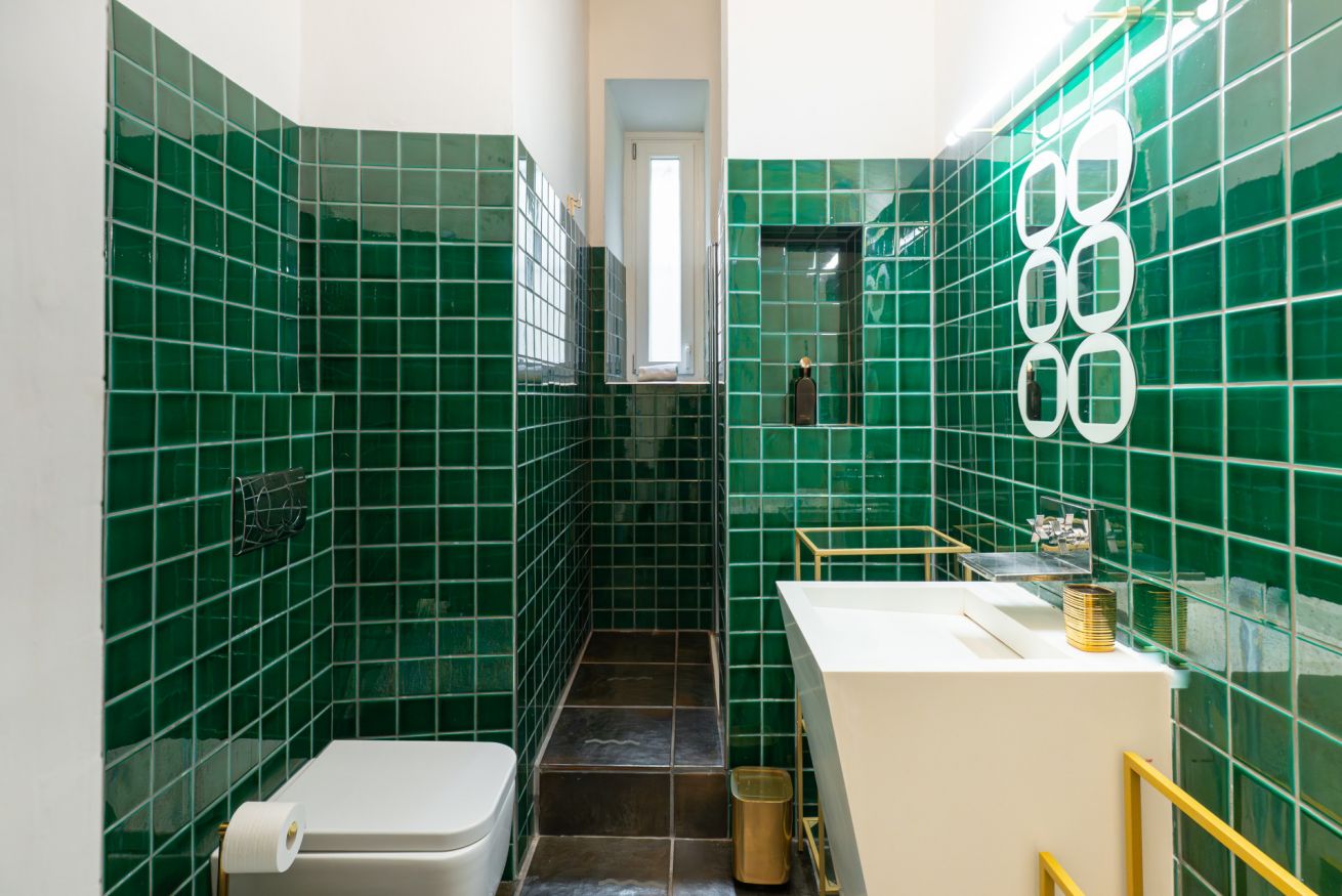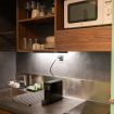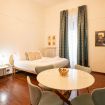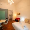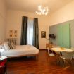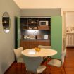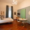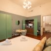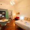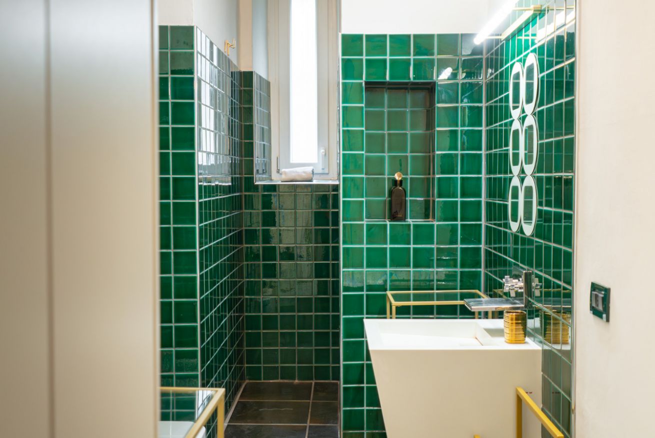 L’atmosfera è calda, con richiami art déco e palette sofisticate che valorizzano la luce naturale. Non è il classico monolocale “compresso”: qui gli spazi sono ben distribuiti e vivibili.