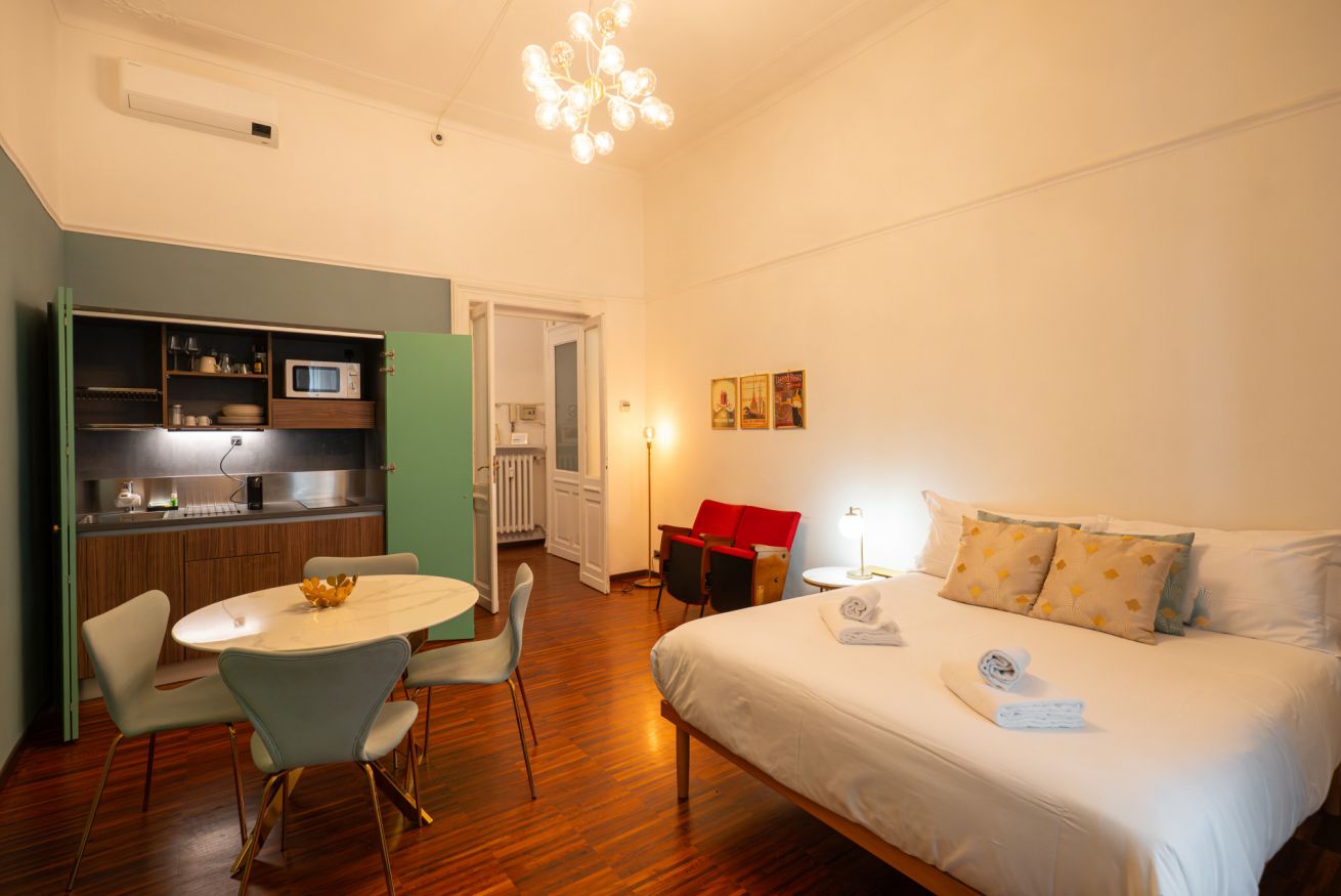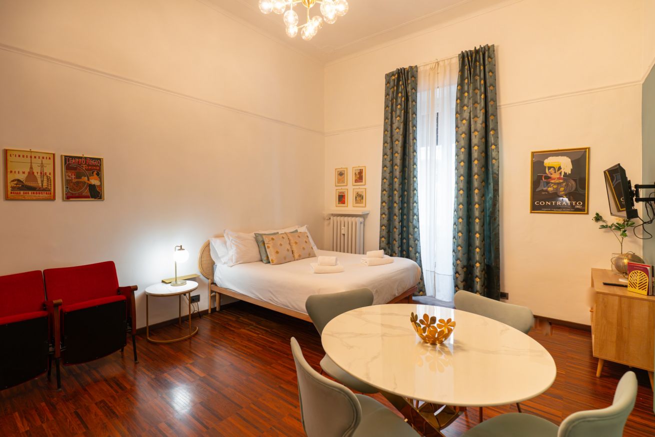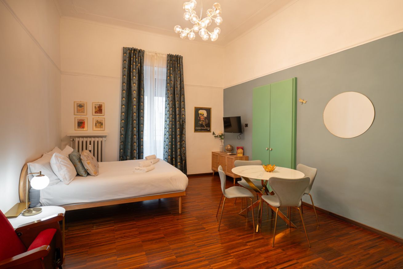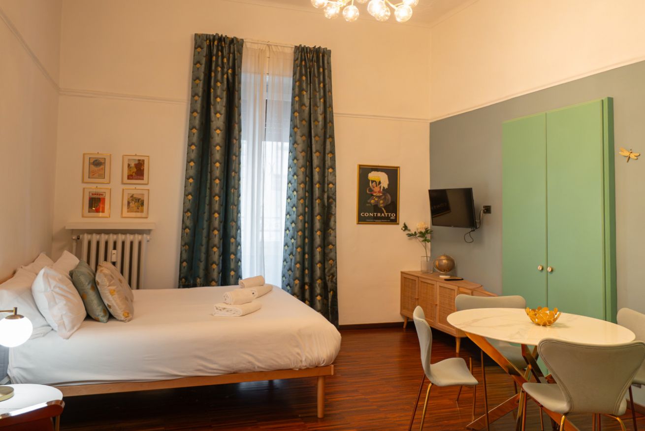 A pochi minuti a piedi da Porta Nuova, l’appartamento unisce posizione strategica, design curato e comfort reale: un ambiente ampio, luminoso e con soffitti alti che trasmettono subito una sensazione di respiro e qualità.