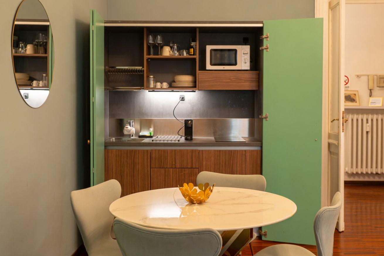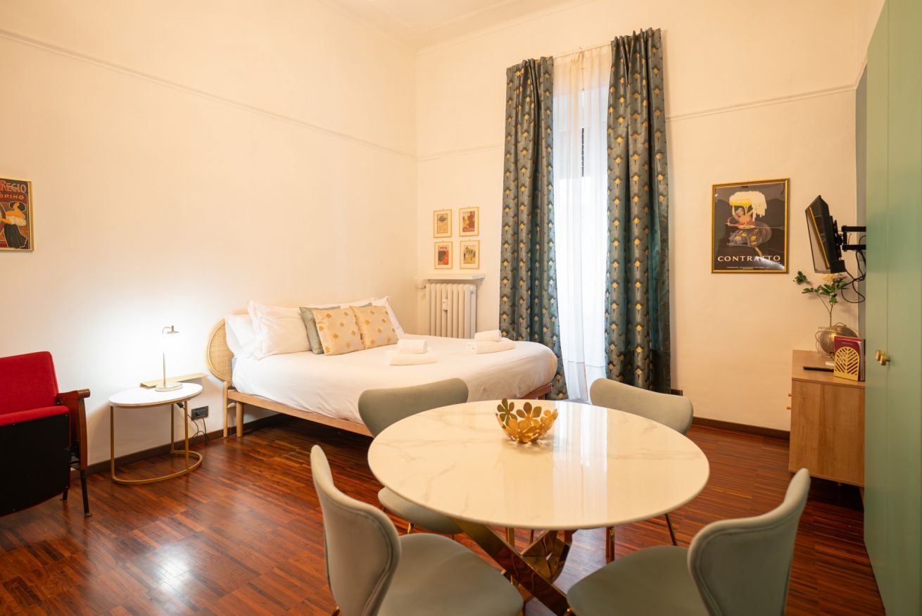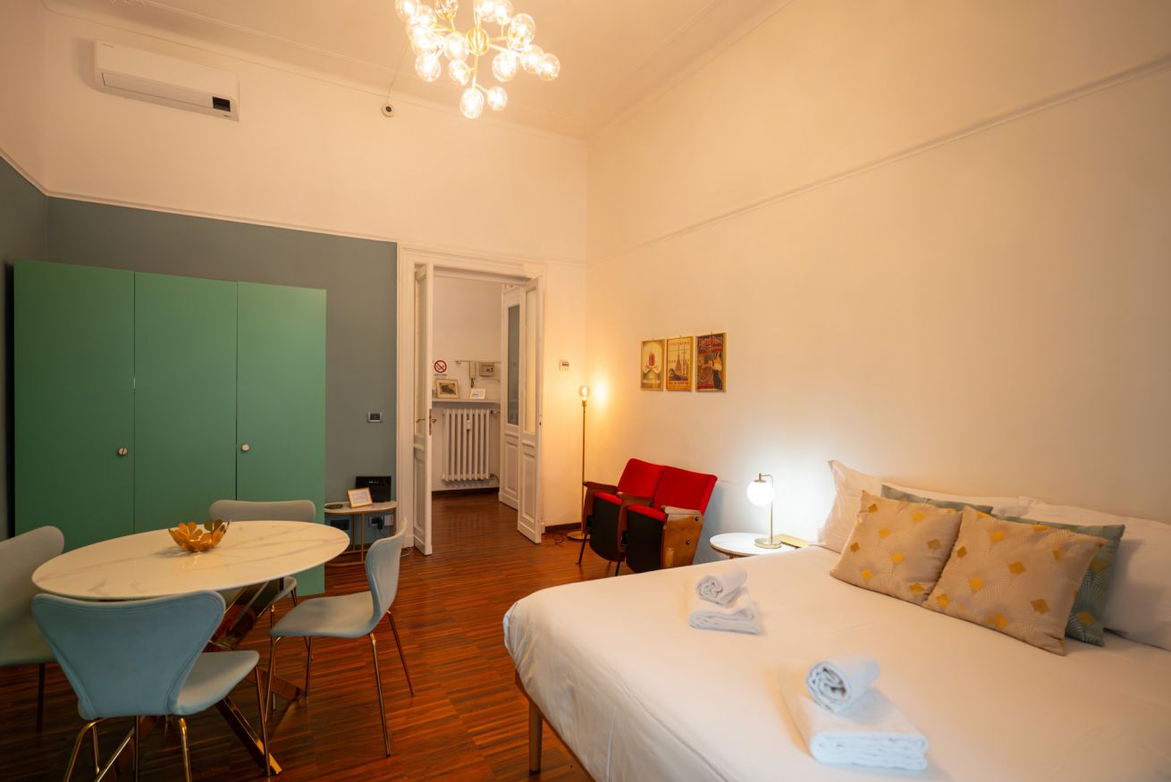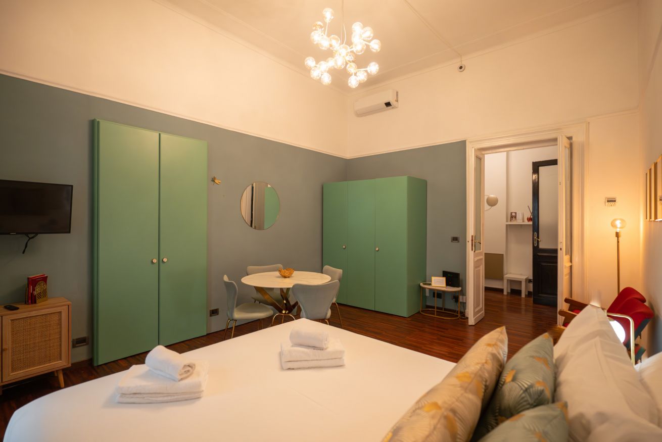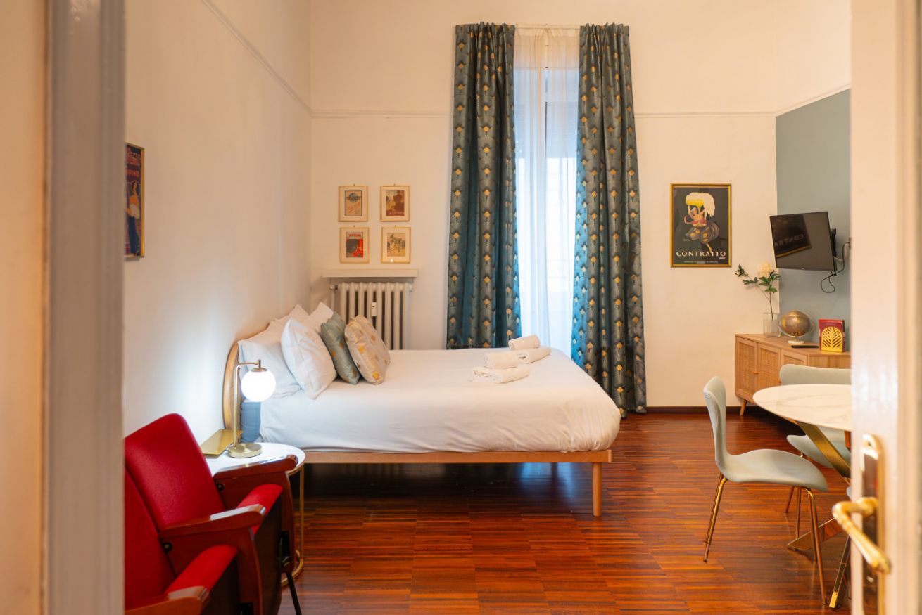 A pochi minuti a piedi da Porta Nuova, l’appartamento unisce posizione strategica, design curato e comfort reale: un ambiente ampio, luminoso e con soffitti alti che trasmettono subito una sensazione di respiro e qualità.