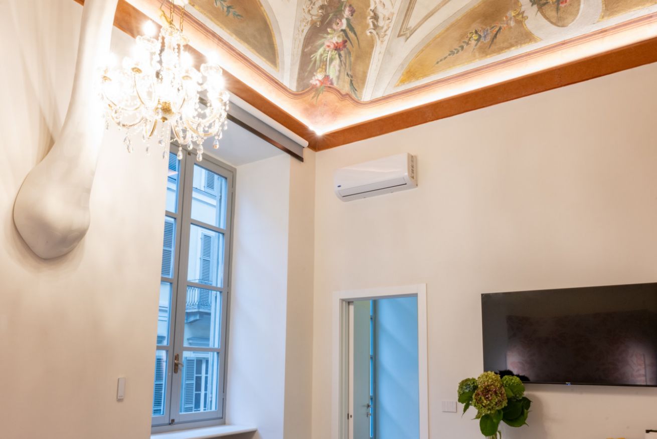 Entrambe le camere sono arredate con finiture di pregio, e la suite vanta elementi moderni come desk, TV a parete e angolo caffè in ciascuna camera. Una delle camere è caratterizzata da un'ampia porta finestra che accede a un piccolo balcone, mentre l'altra presenta un soffitto a volta elegantemente affrescato.